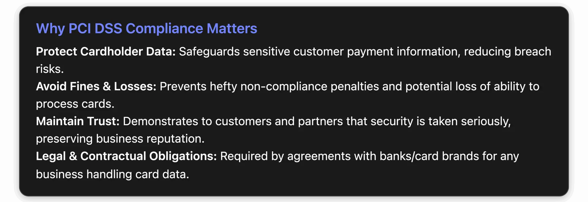 PCI DSS compliance is enforced contractually by payment brands via your acquiring bank. If you handle card payments – whether you’re a retail chain processing POS transactions, a financial institution handling credit card info, a telecom offering online bill payments, or a payment processor serving merchants – you must meet PCI DSS requirements to continue operations smoothly. Non-compliance can lead to penalties or even losing the ability to process cards, not to mention damaging customer trust and brand reputation.