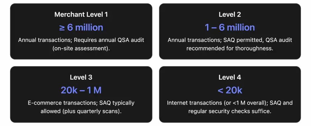 Audit vs. Self-Assessment: Depending on your business’s size and transaction volume (often referred to as merchant level), you may either be required to undergo a QSA-led audit or allowed to self-certify via the SAQ. For instance, Level 1 merchants (processing over 6 million transactions/year or those who have had a breach) must have an annual external assessment by a QSA. Levels 2–4 (smaller volumes) can often use the SAQ, but many still opt to work with QSAs or consultants to ensure nothing is missed. The table below summarizes merchant levels and typical validation requirements: